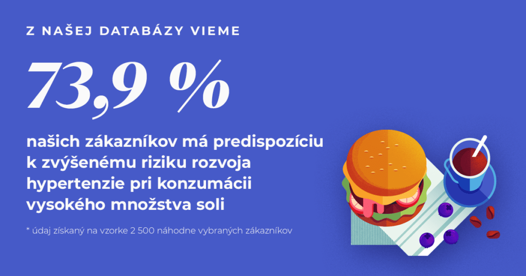 Predispozícia spojená so soľou sa nachádza aj v našich DNA testoch. Konkrétne ide o riziko rozvoja hypertenzie pri nadmernom užívaní soli, teda zvýšená citlivosť na soľ. Hypertenzia, alebo vysoký krvný tlak, je jedným z najčastejších srdcovo-cievnych ochorení na svete. Veľké množstvo štúdií preukázalo, že nevynímajúc ďalšie výživové faktory, kuchynská soľ predstavuje pri určitej genetickej predispozícii podstatný faktor spoluzodpovedný za rozvoj hypertenzie a zároveň znížený príjem soli, resp. sodíka, znižuje systolický a diastolický krvný tlak a zvyšuje účinok antihypertenzív.