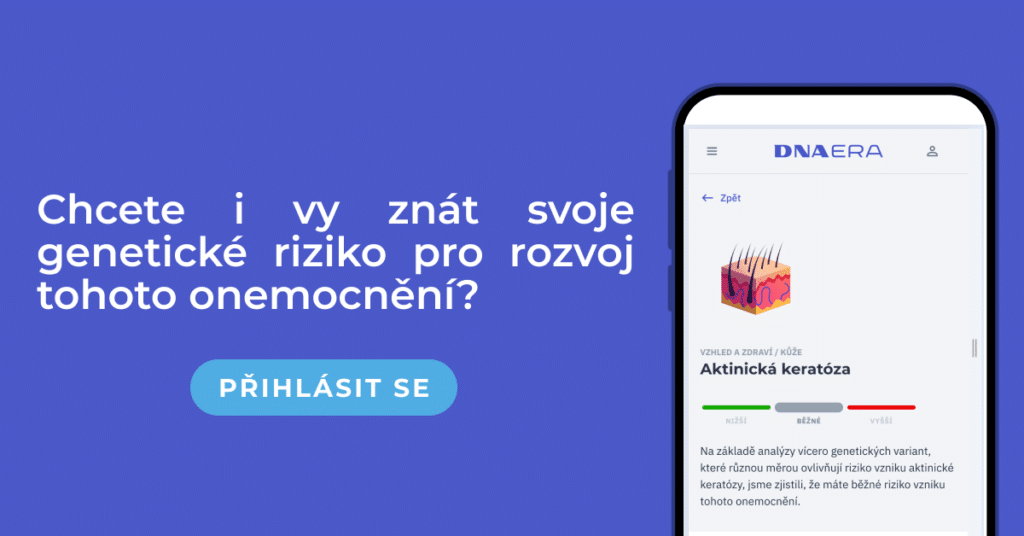 Výsledek spolu s dalšími informacemi ohlědně aktinické keratózy je odteď zdarma dostupný pro všechny naše zákazníky. Přihlaste se do svého účtu a dodržujte základní preventivní opatření. Nový výsledek získají i všichni budoucí zákazníci, kteří si objednají DNA Complex test, DNA Beauty test nebo si rozšíří výsledky o kategorii Vzhled a zdraví.