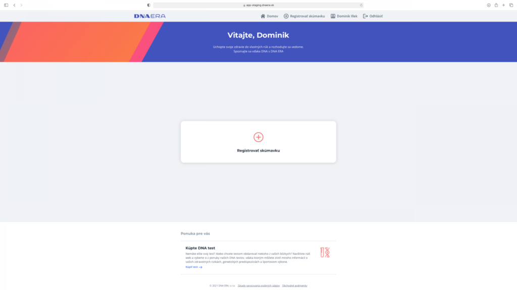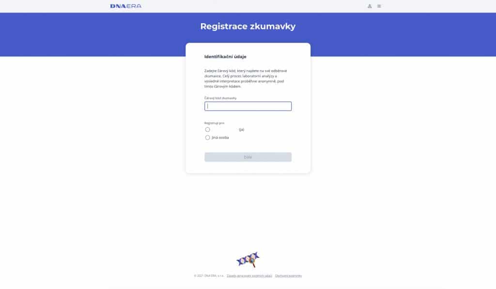 Podmínkou úspěšné analýzy vaší DNA je vytvoření účtu a registrace zkumavky v našem interním systému na www.app.dnaera.sk. Váš účet je chráněn heslem a od všech uživatelů vyžadujeme také dvoufaktorovou autentifikaci pomocí SMS zprávy, která bude odeslána na vámi zadané mobilní číslo. Bez vykonání registrace odběrové zkumavky není možné postoupit k laboratorní analýze, protože z naší strany není možné její přiřazení k zákazníkovi.é postúpiť vzorku na laboratórnu analýzu, pretože z našej strany nie je možné jej priradenie k zákazníkovi.