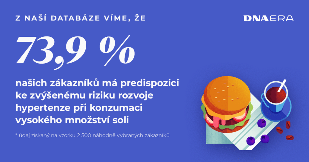 Predispozice spojená se solí se nachází i v našich DNA testech. Konkrétně jde o riziko rozvoje hypertenze při nadměrném užívání soli, tedy zvýšená citlivost na sůl. Hypertenze, nebo vysoký krevní tlak, je jedním z nejčastějších srdečně-cévních onemocnění na světě. Velké množství studií prokázalo, že nevyjímaje další výživové faktory, kuchyňská sůl představuje při určité genetické predispozici podstatný faktor spoluzodpovědný za rozvoj hypertenze a zároveň snížený příjem soli, resp. sodíku, snižuje systolický a diastolický krevní tlak a zvyšuje účinek antihypertenziv.