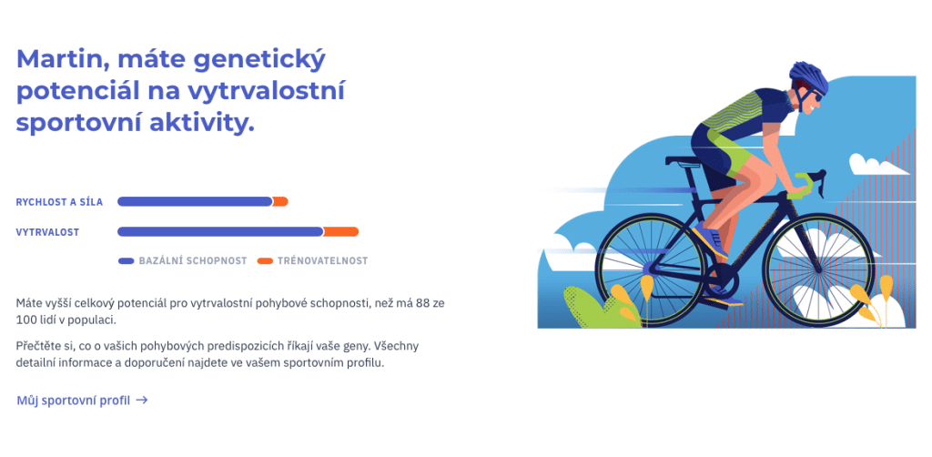 Vaše analýza může sestávat z mnoha zajímavých zjištění, jako je například nižší riziko rozvoje obezity, zrychlený metabolismus kofeinu, nižší riziko vzniku karcinomu prsu a v neposlední řadě i určení vašeho sportovního profilu, kde zjistíte, na který typ sportovních aktivit máte díky vašim genům vyšší potenciál, jak se v daném typu aktivit dokážete vytrénovat a i seznam sportů, které patří do vašeho profilu. Díky tomu možná odhalíte, proč jste na hodinách tělesné výchovy nezvládal/a běhat 12-minutovky, ale naopak, v posilovně nebo při basketbalu jste zvládali víc než vaši spolužáci. Analýzu DNA u nás absolvovalo vícero profesionálních sportovců, a jejich výsledky sportovního profilu, ale i náchylnost na různé sportovní zranění, často kopírovaly realitu. Recenze Moniky Chochlíkové (světová šampionka WAKO K1 a WMC MT) a Tomáše Tadlánka (muay thai zápasník a trenér) najdete na našem webu