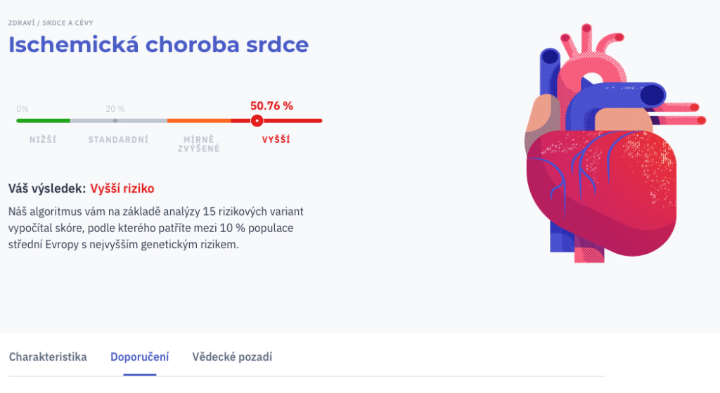 Jednou z našich zásad je zprostředkovat zákazníkům pouze ty výsledky, v rámci kterých jim dokážeme dát doporučení, personalizované podle jejich genetické predispozice. Uveďme si to na příkladu. Pokud zákazníkovi vyjde vyšší genetické riziko k rozvoji ischemické choroby srdce, kromě charakteristiky onemocnění, jeho spouštěčů a samotných výsledků zákazníka (s přesným seznamem rizikových míst v jeho DNA), je součástí reportu i záložka s doporučeními. Při ischemické chorobě srdce si zákazník najde mezi doporučeními například: