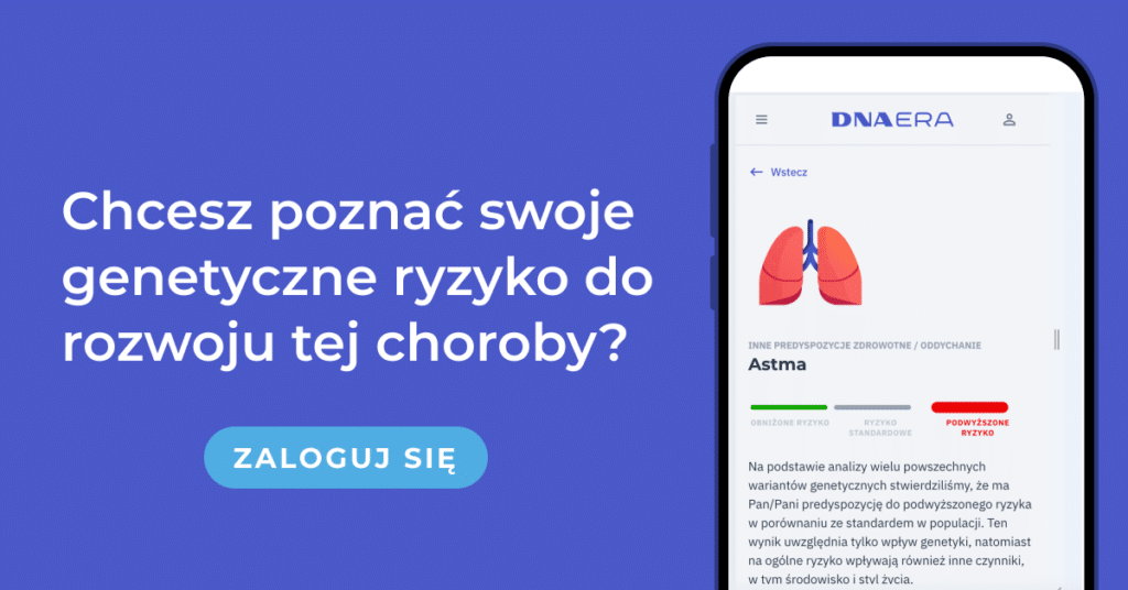 Zaloguj się do swoich wyników. Genetyczna predyspozycja do rozwoju astmy jest od teraz bezpłatnie dostępna dla wszystkich naszych klientów. Będzie ona również uwzględniona w analizie każdego przyszłego klienta, który wejdzie w świat DNA z testem DNA Complex lub DNA Health. Poznaj swoje predyspozycje już dziś.