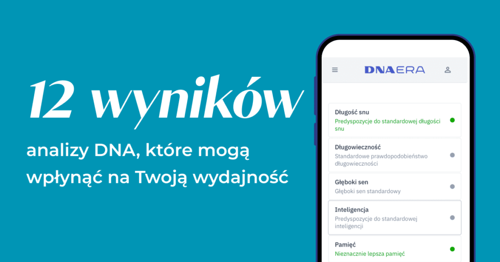Kategoria Produktywność jest przeznaczona dla każdego, kto wykonał jakikolwiek test DNA ERA. Nie ma potrzeby ponownego pobierania materiału genetycznego – wystarczy, że wykupisz nową kategorię online, a wyniki natychmiast pojawią się na Twoim koncie. Zaloguj się do aplikacji, aby rozszerzyć swoją analizę o nowe wyniki. Jeśli nie robiłeś(aś) jeszcze testu DNA, wybierz najbardziej odpowiedni dla siebie, a po otrzymaniu wyników będziesz mógł(a) rozszerzyć je o kolejne kategorie.