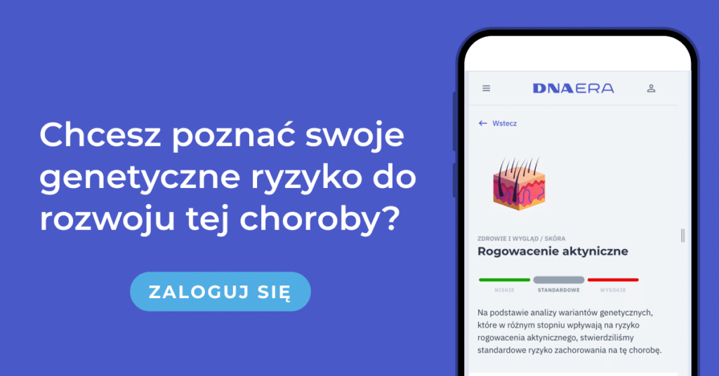 Wynik wraz z innymi informacjami dotyczącymi rogowacenia słonecznego jest teraz dostępny bezpłatnie dla wszystkich naszych klientów na ich koncie. Dostęp do tej predyspozycji uzyskają także wszyscy przyszli klienci, którzy kupią test DNA Complex lub test DNA Beauty albo rozszerzą swoje wyniki o kategorię Wygląd i zdrowie.